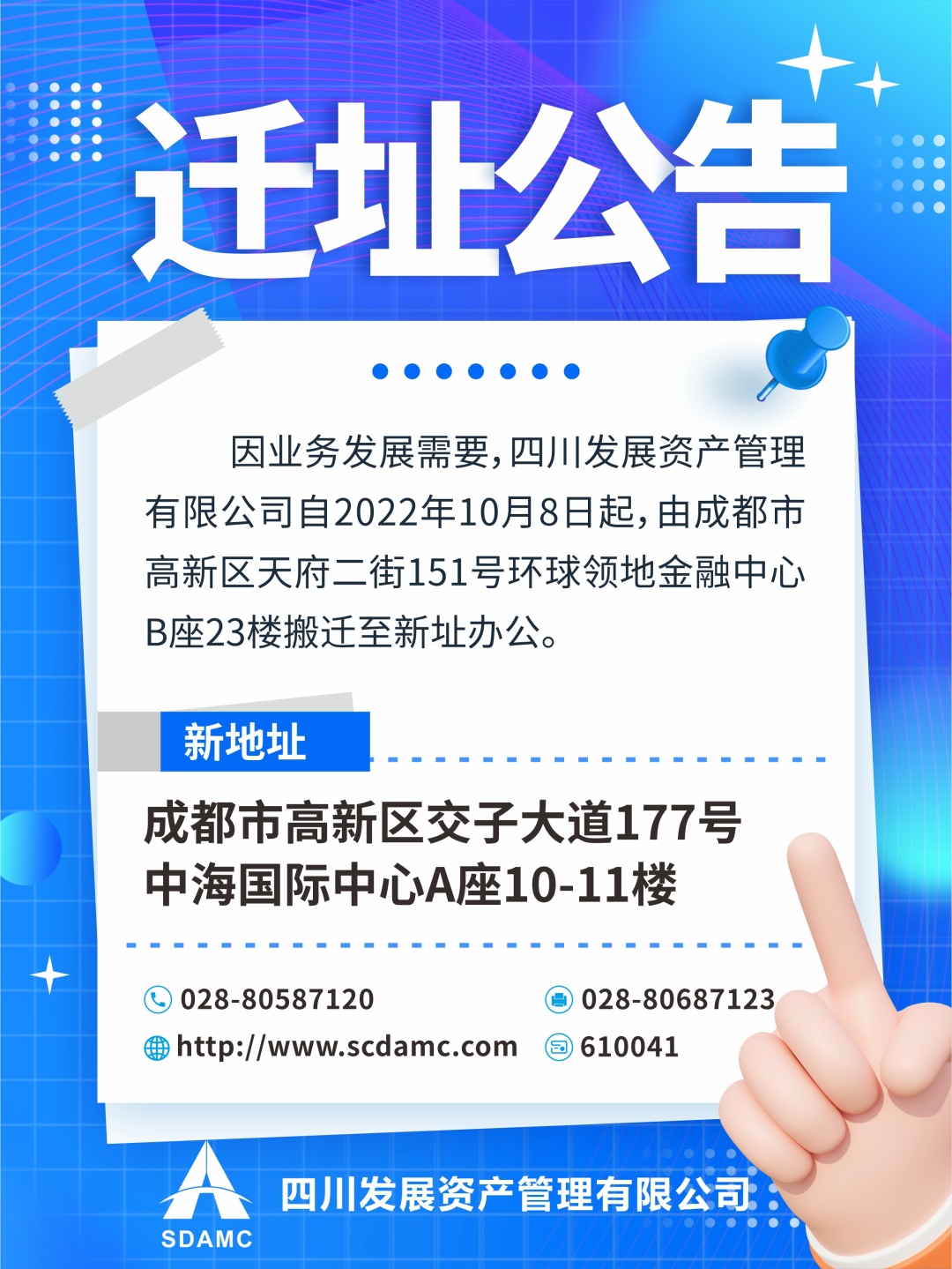因業(yè)務(wù)發(fā)展需要,四川發(fā)展資產(chǎn)管理有限公司自2022年10月8日起,由成都市高新區(qū)天府二街151號環(huán)球領(lǐng)地金融中心B座23樓搬遷至新址辦公。